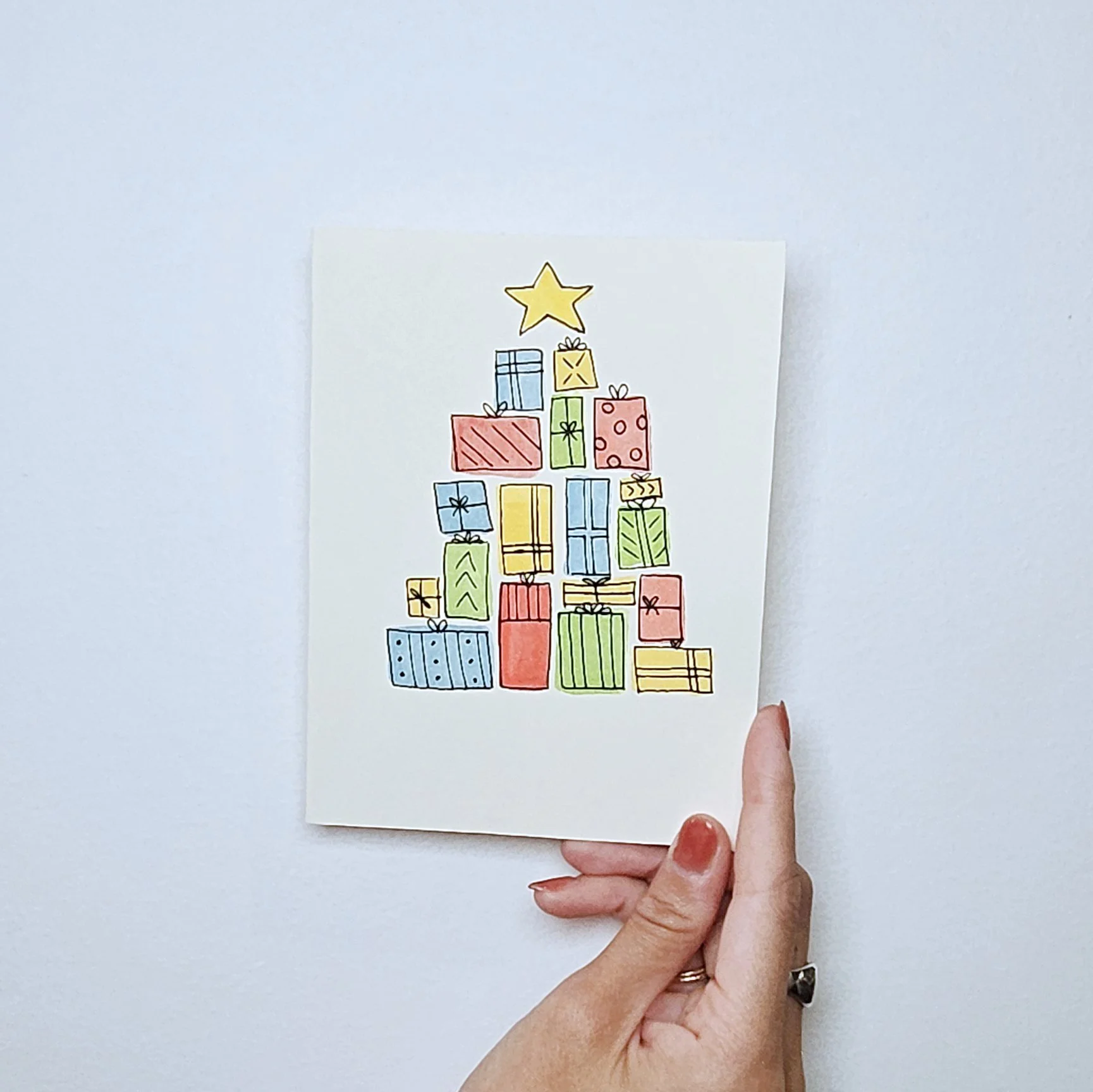 Image 1 of 1 Present Tree Card $5.00 This festive Christmas card features a colorful Christmas tree made out of presents. *blank inside**comes with envelope* Quantity: Add To Cart Added! This festive Christmas card features a colorful Christmas tree made out of presents. *blank inside**comes with envelope*